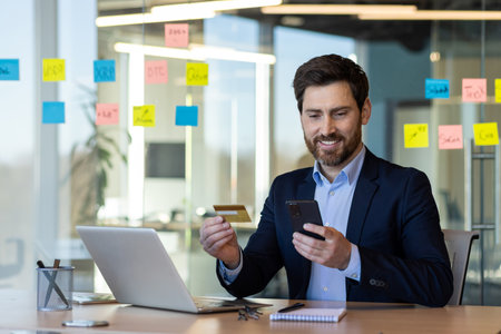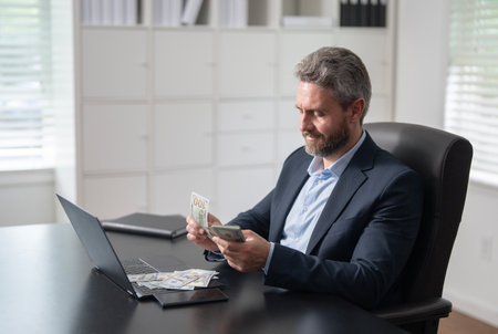 Businessman in suit smiling while holding cash and using smartphone at office desk. Man working on laptop, making online transactions, managing finances. Concept of success, financial growth, business achievement