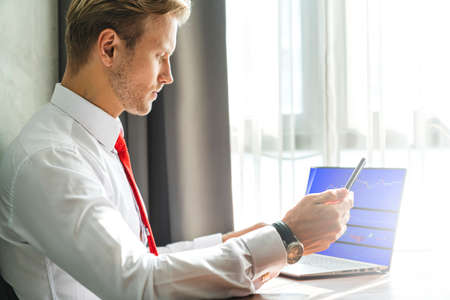 smart caucasian businessman concentrate focus working with laptop and smartphone office background