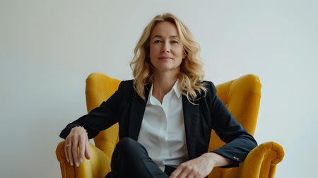 A professional-looking woman sits confidently in a vibrant yellow chair, exuding leadership and poise. A.I.