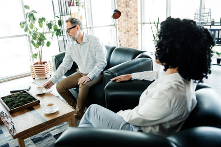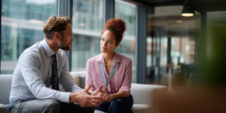 Two individuals, a man and a woman, are seated in armchairs. They are engaged in a discussion within a room featuring neutral tones and diffused lighting. The image suggests a focused interaction. This scene could be suitable for a variety of editorial or commercial purposes.