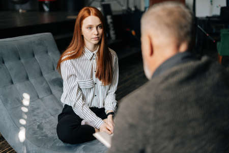 Attractive young woman with red hair lying on armchair talking about his problems with professional mature man psychotherapist or psychologist in cozy office room.