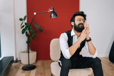 Medium shot of confident Indian businessman wearing elegant formalwear sitting on chair, smiling looking away. Front view of friendly Indian young man in fashion glasses posing at studio.