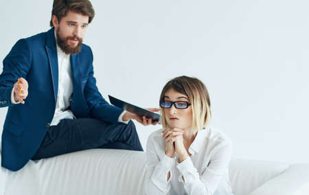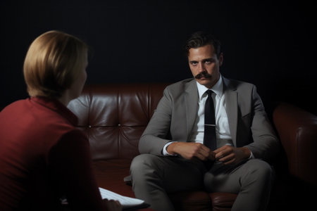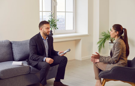 A woman psychologist with documents sits on the couch and a man on a chair in a suit