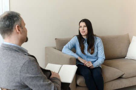 Woman patient with male psychologist consulting and doing psychotherapy with doctor in clinic. Psychiatrist concept