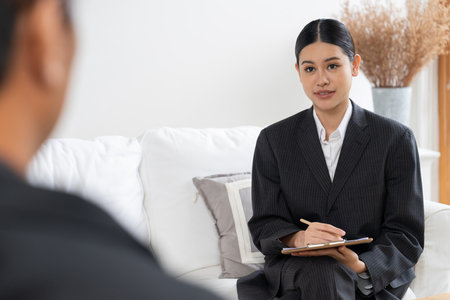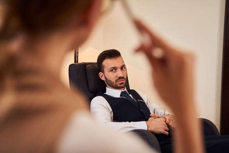 Professional woman working as a psychologist and offering help and advice to a sad man with depression during therapy