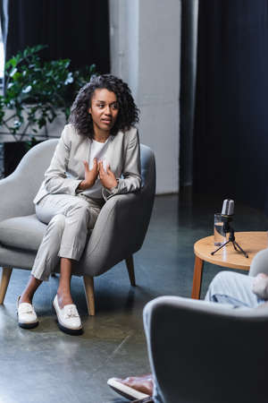 african american journalist gesturing while talking with blurred guest sitting in armchair during interview