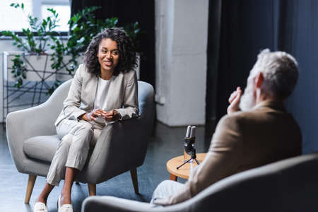 happy african american journalist gesturing while talking with blurred businessman sitting in armchair during interview