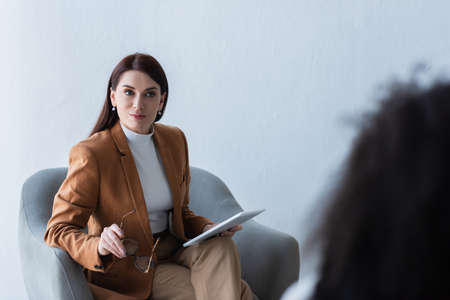 psychologist holding digital tablet and eyeglasses during consultation with blurred patient