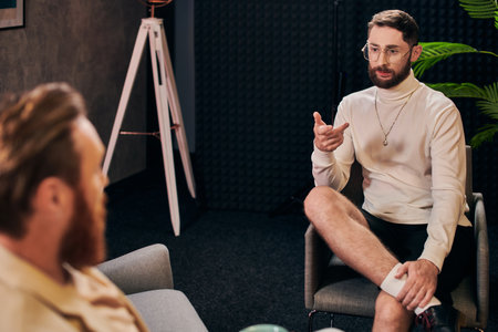 attractive bearded man with glasses in elegant clothes sitting next to his interviewer in studio
