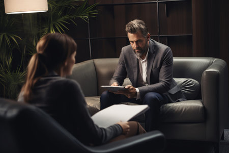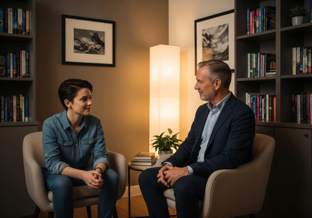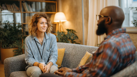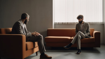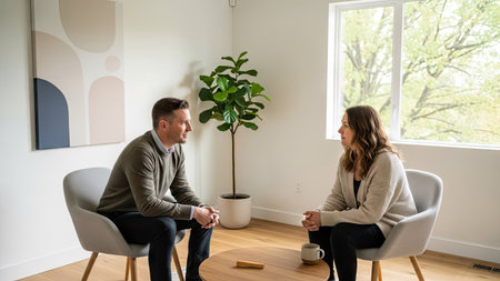 In a well-lit office, a therapist and patient are engaged in a counseling session. The scene features a wooden desk, a comfortable sofa, and decorative plants. The warm lighting and soft textures create a calming atmosphere. Suitable for illustrating mental health, therapy, or related topics.