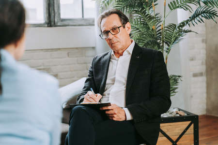 Mature gray-haired male psychotherapist with clipboard in session with female patient. Smiling caucasian woman at a psychologist appointment.