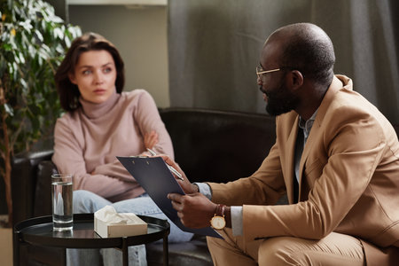 Young African Woman Sitting Near Psychologist With Clipboard To Treat Depression