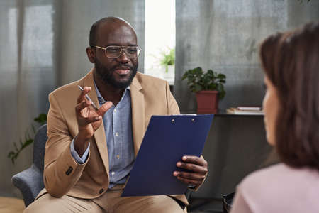 Content bald Black psychiatrist in glasses sitting with clipboard and analyzing problem of patient during therapy