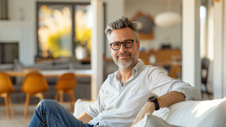 A man in his forties, dressed casually, smiles while sitting comfortably on a sofa. The spacious living room features natural light and contemporary decor.