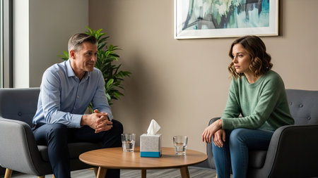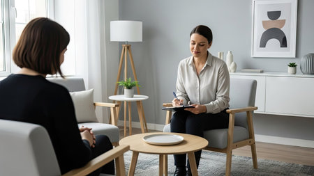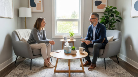 In an interior space, a woman consults with a therapist. The scene features neutral tones and soft lighting. The composition includes chairs, a table, and decorative elements. This image may be used for editorial content related to mental health or therapeutic practices, as well as for general healthcare projects.