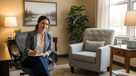 A woman sits in a chair taking notes while smiling in a well-lit indoor setting. The scene features warm color tones, natural light, and a comfortable interior design. The image could be suitable for articles related to mental health or editorial content on counseling and therapeutic practices.