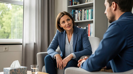 A therapist in a blue blazer and a male client are engaged in a counseling session. The indoor scene features soft lighting, a neutral color palette, and two armchairs. This image is suitable for content related to mental health, therapy, professional support, or editorial articles.