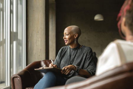 Portrait of a confident and compassionate female psychologist listening intently to her patient in a cozy and inviting therapy office with a bookshelf in the background