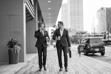 Photo of businessmen in suits walking outdoor through city street. Two businessmen walking and talking in the city. Business men talking outdoors. Walking and talking between two business men.