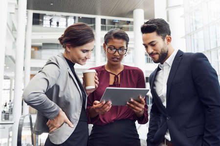 Cropped shot of a diverse group of young businesspeople using a digital tablet while having a discussion in a modern workplace