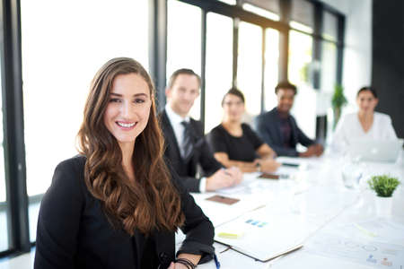 Me and my team. Cropped portrait of an attractive young businesswoman standing in the boardroom with her arms folded and her colleagues in the background.