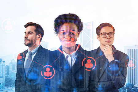 Business people team in office look far. Future vision, teamwork startup an partnership concept. Double exposure