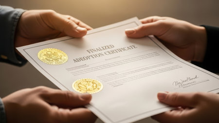 The image depicts a significant moment where a finalized adoption certificate is being handed over from one person to another. The certificate features official seals and signatures, signifying the completion of an adoption process. The hands of the individuals are prominently shown, emphasizing the importance and emotional weight of the document being exchanged.