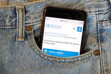 Saint Petersburg, Russia - 17 March 2020: Coronavirus disease COVID-19 advice for the public from World Health Organization. Who.int website on phone screen in jeans pocket , Illustrative Editorial.
