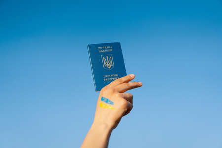 100 dollars banknote inside Ukrainian passport one passport lies next to a blue background closeup traveling business