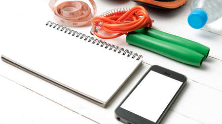 fitness equipment : running shoes,jumping rope,drinking water,notebook,measuring tape and phone on white wood table