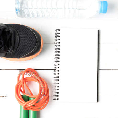 fitness equipment : running shoes,jumping rope,drinking water and notepad on white wood table vintage style