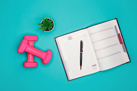 On a turquoise background are pink dumbbells, a houseplant and a diary with a pen for recording the training regime, proper nutrition, physical activity and water balance
