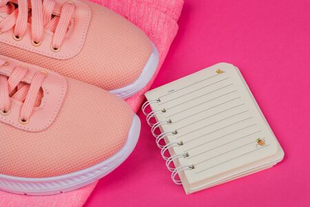 Sneakers and notebook. Doing sports on a pink background.