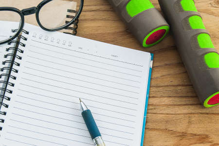 Dumbbell,measuring tape, glasses with diary book on wood background, exercise program fitness concept, Planning control diet concept.