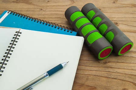 Dumbbell with diary book on wood background, exercise program fitness concept, Planning control diet concept.