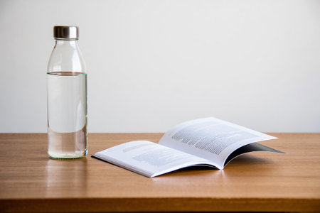 Open book and water bottle. Study or relaxation in minimalist setting.