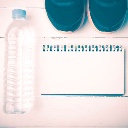 fitness equipment : running shoes,drinking water and notebook on white wood table vintage style
