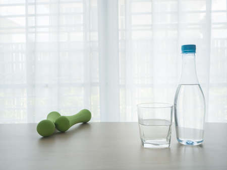 wood table with bottle of pure water and green weight dumbbell on blurry beautiful white drape window texture background.