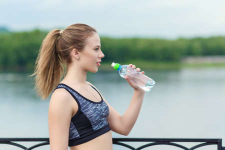 Young woman is refreshing after workout and drinks water at outdoor