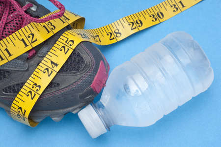 tape measure and mineral water bottle isolated on a blue background