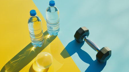 Minimalistic sport concept. Blue plastic dumbbells, bottle of water on colored paper background. Top view