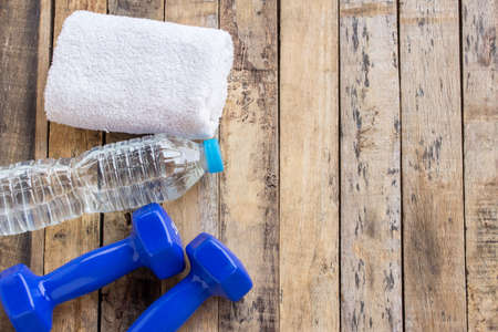 Blue dumbbells,towel and bottle water on wooden table. Fitness concept