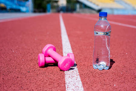 sport tool and equipment. dumbbells on racetrack in stadium. hydration after fitness. healthy lifestyle. water balance in body while workout. barbells and bottle on running track