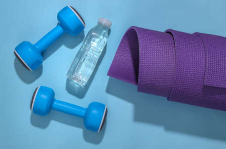 Rolled yoga mat, dumbbells and water bottle on a bright blue background. Healthy lifestyle concept. Top view flat lay