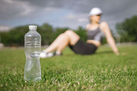 Beautiful Caucasian girl athlete dressed in sportswear with fitness tracker on stadium sits on grass. Selective focus on plastic water bottle. Happy female sport and healthy lifestyle concept