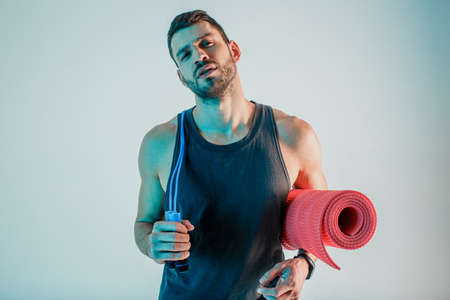 Sportsman with skipping rope and fitness mat
