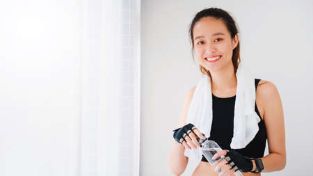Asian beautiful women holding water bottle after play yoga and exercise on white wall background with copy space.Exercise for Lose weight, increase flexibility and tighten the shape.