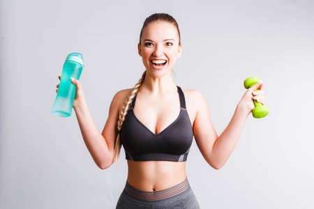 Beautiful athletic girl with a blue shaker on a light gray background.