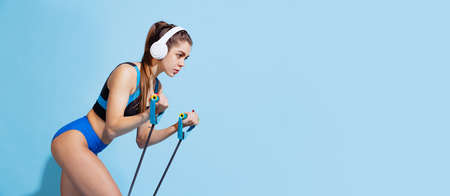 One young beautiful sportive girl in sports uniform training with sports equipment isolated on blue studio background. Sport, action, fitness, youth concept.