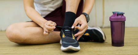 Happy Asian young sportsman trying to tie shoelaces before getting an exercise, man preparing for out workout. Healthy Asian young sporty man tie up a running shoes before running.